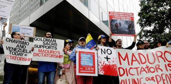 "Jalur keuangan Goldman Sachs ke rezim tersebut akan memperkuat represi brutal yang melancarkan serangan terhadap ratusan ribu orang Venezuela yang secara damai memprotes perubahan politik di negara tersebut, "kata Julio Borges, ketua Kongres Venezuela, dalam sebuah surat kepada presiden Goldman Sachs Lloyd Blankfein.
