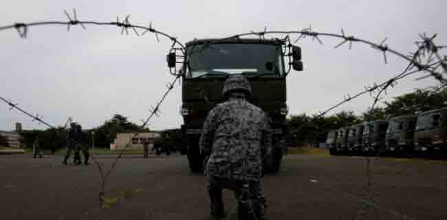 Baterai Patriot PAC-3 melaju ke pangkalan Asaka Self Defense Forces dekat Tokyo, memasang antena radar dan mengangkat peluncur rudalnya ke posisi menembak.