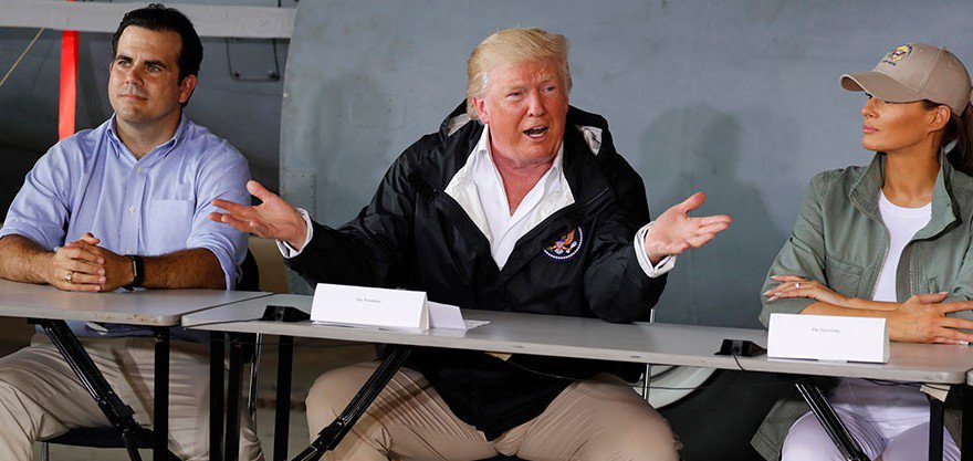 Trump mengunjungi Puerto Riko setelah hampir dua minggu setelah Badai Maria menghancurkan infrastruktur pulau itu dan meninggalkan mayoritas 3,5 juta penduduk hidup tanpa akses serta sambungan komunikasi, air dan listrik yang minim.
