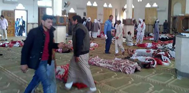 Media pemerintah menunjukkan foto korban luka-luka dan banyak tubuh yang ditutupi selimut di Masjid Al Rawdah di Bir al-Abed, sebelah barat kota El Arish.