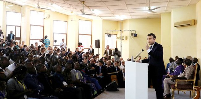 Macron tidak menyentuh masalah keamanan dan migrasi dalam pidatonya, namun sebagian besar menawarkan kemitraan di bidang pendidikan, energi terbarukan, perusahaan startup, transportasi dan kesehatan. Dia mengatakan bahwa potongan seni Afrika di koleksi Eropa harus dikembalikan ke Afrika, dan meminta kerjasama yang lebih erat antara bioskop Prancis dan Afrika.