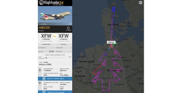 Pilot tersebut merupakan kru Airbus yang sedang menguji Airbus A380. Saat membawa pesawat dalam ujicoba ia menghasilkan gambar berwarna yang jelas-jelas diberikan di situs pelacak penerbangan Flightradar24 membentuk garis serupa pohon Natal.