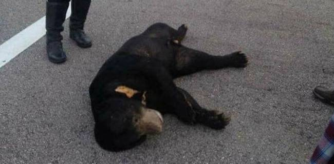 Sementara itu bangkai beruang madu seberat 100 kilogram tergelatk di jalan sebelum akhirnya diserahkan ke Departemen Margasatwa Negara Bagian.