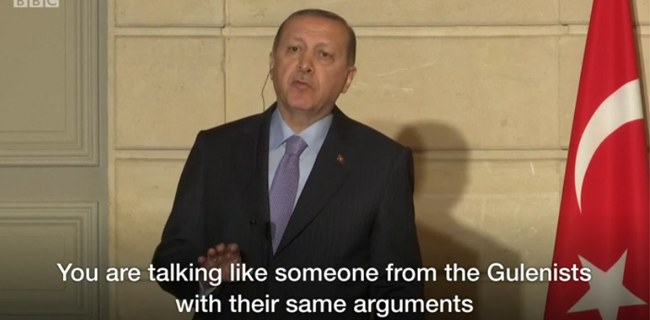 Menjawab pertanyaan tersebut, Erdogan menuduh Laurent Richard berbicara seperti seorang Gulenis. Gulenis sendiri merujuk pada sebuah kelompok Islam yang dilarang karena kudeta yang gagal 2016 dan dipimpin oleh ulama yang diasingkan di Amerika Serikat, Fetullah Gulen.