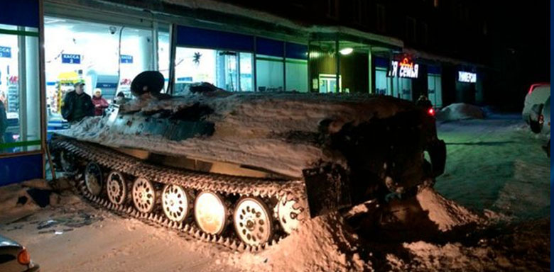 BBC mengutip sumber lokal, pria yang tak disebutkan namanya itu dilaporkan mencuri sebuah kendaraan lapis baja dan menabraknya ke sebuah toko di sebuah kota Apatity, Rusia.