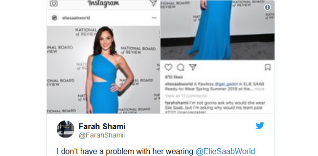 "Saya mencintai dan menghormati Elie Saab, tapi apakah dia benar-benar bahagia seorang aktris Israel mengenakan gaun yang dia rancang?" tanya wartawan Libanon Heba Bitar di Twitter.
