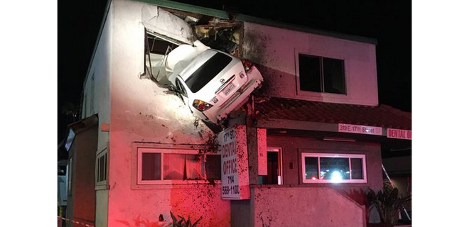 Kendaraan itu merusak tembok, lantai dua perkantoran di kota Santa Ana, Orange Minggu di subuh hari (14/1).