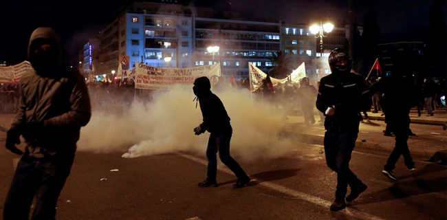 Para demonstran berkumpul bersama melawan sebuah undang-undang penghematan yang berjumlah lebih dari 1.500 halaman, yang disetujui oleh anggota parlemen dari koalisi pimpinan yang dipimpin akhir Senin malam (15/1) waktu setempat.