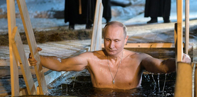 Putin kemudian menanggalkan mantel dan sepatu botnya lalu berjalan menyusuri satu set tangga kayu ke dalam lubang di es, menyilangkan tubuhnya, dan mencelupkan kepalanya ke bawah air sebelum muncul kembali.