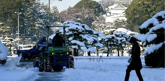 Petugas membersihkan salju yang menutupi sebagian besar wilayah Tokyo pagi tadi (Selasa, 23/1). Salju setebal hingga 20 cm menutupi jalanan, jembatan serta terowongab. Hal itu mengakibatkan lalu lintas terganggu serta sejumlah sarana transportasi publik mengalami gangguan.