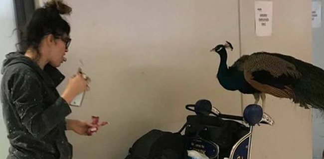 BBC dengan merujuk travel blog Live dan Let Fly, wanita yang tidak disebutkan namanya itu sempat menyita perhatian pengunjung bandara saat membawa merak di bandara Newark di New Jersey. Dia menawarkan diri untuk membeli tiket ekstra untuk hewan peliharaannya itu namun tidak diizinkan oleh pihak maskapai.
