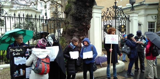 Demonstrasi tersebut, yang diselenggarakan oleh Kelompok Kampanye Melawan Perdagangan (CAAT) yang berbasis di Inggris, menampilkan para aktivis yang mengungkapkan kemarahan mereka atas penjualan senjata ke Saudi. Mereka menilai bahwa dengan penjualan itu, Inggris sama saja mengakui pertumpahan darah yang sedang berlangsung yang telah membawa lebih dari 13.500 orang Yaman tinggal sejauh ini.