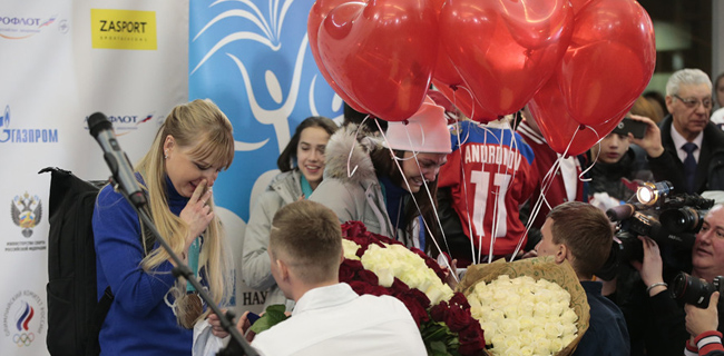 Para atlet dari Rusia disambut oleh tentara penggemar yang melambaikan bendera nasional Rusia dan menyanyikan lagu-lagu patriotik untuk menghormati para atlet yang mengharumkan nama bangsa di Korea Selatan. Mereka menghasilkan 17 medali di Korea Selatan meski Rusia tengah berada di bawah sanksi. Demikian seperti dimuat