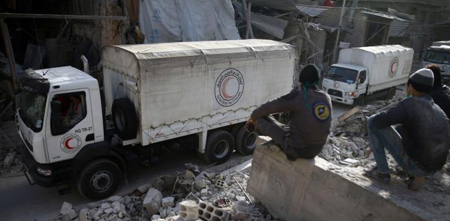 Warga sipil duduk di atas reruntuhan bangunan saat konvoi bantuan kemanusiaan Bulan Sbait Merah Arab-Suriah datang untuk mendistribusikan bantuan ke kota Douma di Ghouta Timur yang terkepung. Ghouta Timur dalam beberapa pekan terakhir berubah menjadi medna pertempuran dengan ratusan korban jiwa melayang akibat serangan udara. Reuters
