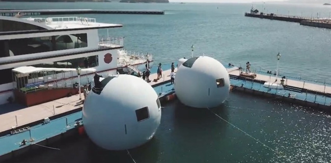 Hotel berbentuk lingkaran bak bola ini dapat terapung di air dan diklaim sebagai salah satu solusi yang mungkin bisa digunakan bagi risiko gempa dan tsunami di negeri sakura.