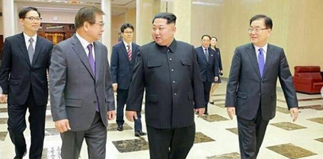 Sementara Jong Ui Yong menyerahkan surat pribadi Moon Jae In kepada pemimpin tertinggi Kim Jong Un.