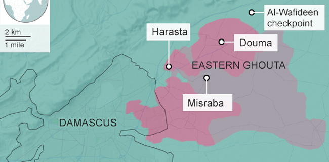 BBC, 25 truk yang membawa bantuan makanan masuk ke kota Douma. Komite Palang Merah Internasional (ICRC) mengatakan bahwa bantuan tersebut hanya sebagian kecil dari apa yang dibutuhkan di Ghouta Timur, di mana sekitar 390.000 orang menghadapi kekurangan pasokan makanan dan obat-obatan.