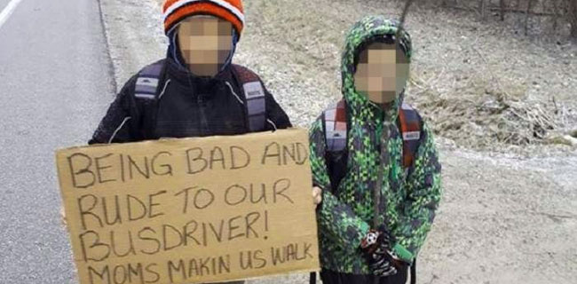 Seorang ibu di Ontario, Kanada, menjadi buah bibir setelah nekat menghukum anaknya berjalan kaki ke sekolah. Jarak antara rumah dan sekolah kedua bocah ini berjarak 7 kilometer. Kedua bocah ini memakan waktu dua jam untuk akhirnya bisa sampai ke sekolah.