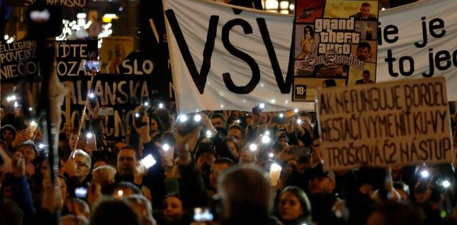 Mereka mengekspresikan kemarahan atas pembunuhan wartawan Jan Kuciak dan tunangannya Martina Kusnirova yang dinilai berkaitan dengan kerja jurnalismenya.