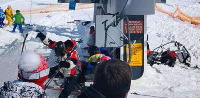 Video kecelakaan di resor Gudauri di Georgia menunjukkan tumpukan kursi yang patah dan bengkok di bagian bawah lift saat orang-orang berdiri berteriak pada orang-orang untuk melompat.