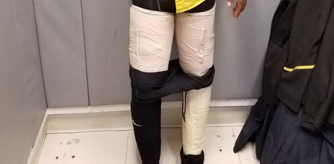 Agen-agen federal mengatakan mereka menemukan empat paket yang ditempelkan di kakinya. Setelah dibuka, ditemukan sembilan pon kokain disita dengan nilai sekitar 160.000 dolar AS.