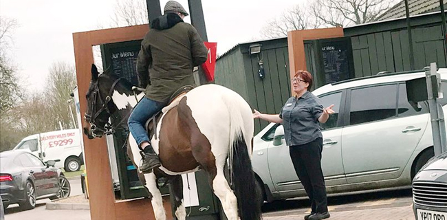 Namun saat memesan di drive-thru, dia ditegur oleh staff McDonald yang mengatakan bahwa dia tidak memesan dengan menunggang kuda.
