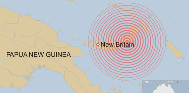 Gempa terjadi di kedalaman dangkal 10 km, sekitar 162 km dari kota Rabaul, di pulau New Britain.