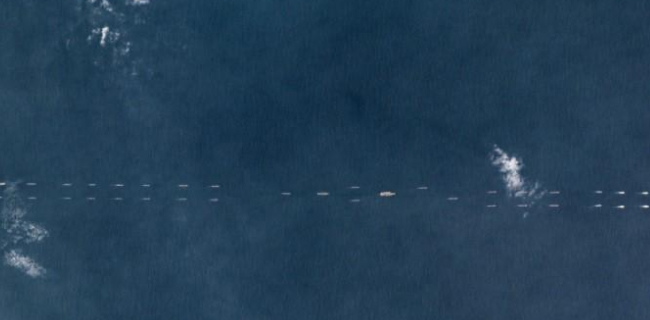 Foto-foto itu, diambil pekan ini dan menunjukkan apa yang tampak setidaknya 40 kapal dan kapal selam mengapit kapal induk Liaoning. Analis menggambarkannya sebagai tampilan luar biasa besar dari kekuatan angkatan laut militer China yang berkembang.