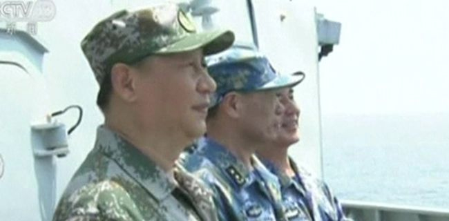 Rekaman yang disiarkan di TV China menunjukkan pemimpin yang menangani pasukan di atas kapal perusak angkatan laut sebelum menonton jet lepas landas dari kapal induk negara itu.