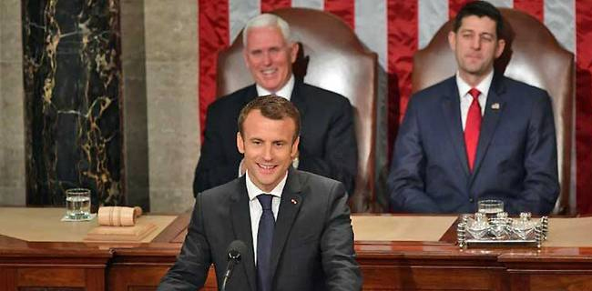 Di hadapan Kongres Amerika Serikat, Macron dengan keras menolak kebijakan perdagangan, iklim, dan non-proliferasi Trump.