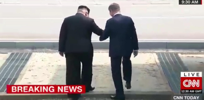 Selesai mengambil gambar, Moon tampak mengajak Kim untuk berjalan menuju ruang pertemuan di perbatasan di sisi Korea Selatan. Namun Kim tampak mengajak Moon terlebih dahulu untuk melintasi perbatasan dan masuk ke wilayah Korea Utara.