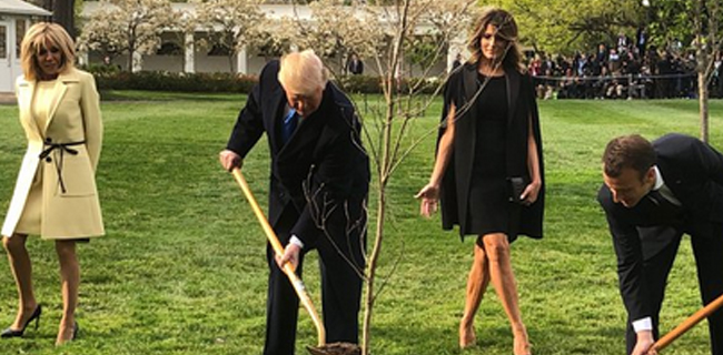 Pohon itu pun ditanam bersama oleh Macron dan Trump di halaman Gedung Putih dengan disaksikan istri mereka masing-masing.