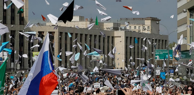 Para pengunjuk rasa, yang diperkirakan berjumlah 12 ribu, meneriakkan slogan-slogan menentang Presiden Vladimir Putin saat mereka meluncurkan pesawat kertas ke udara.