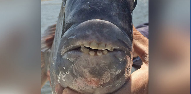 Menurut badan alam pemerintah setempat, makhluk tampak mengerikan itu terpancing keluar dari sungai air asin di Carolina Selatan. Ikan itu dikenal sebagai ikan Sheepshead.