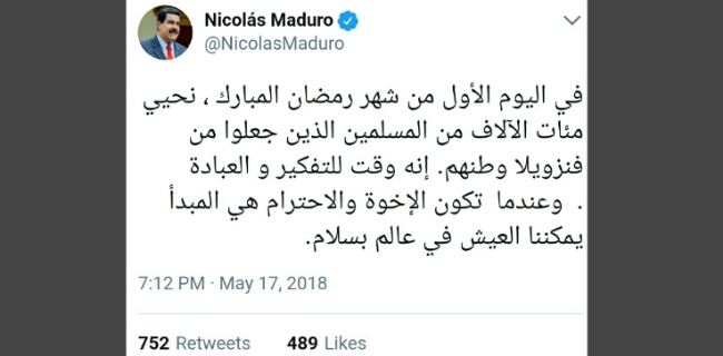 "Di hari pertama di bulan suci Ramadhan, kami memberikan hormat kepada ribuan umat muslim yang menjadikan Venezuela sebagai rumah mereka," ujar Nicolas di akun Twitter