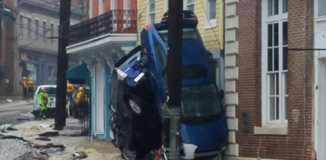 Pasca surutnya air banjir bandang yang menerjang kota Ellicott di Negara Bagian Maryland, Amerika Serikat, banyak gedung yang hancur. Selain itu mobil-mobil warga setempat jungkir balik dalam keadaan hancur.