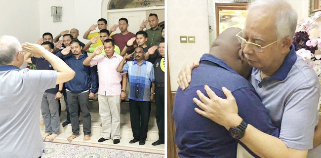 Najib juga mengunggah foto yang menunjukkan ia berdiri di hadapan sekelompok pengawal sambil saling memberikan hormat. "Hari ini, saya membalas salam hormat dan mengucapkan selamat tinggal kepada kelompok pengawal, Unit Tindakan Khas, polisi pengiring, dan pegawai yang ditugaskan untuk menjamin keselamatan dan membantu saya dan keluarga selama di Kantor Perdana Menteri dan kediaman resmi," tuturnya.