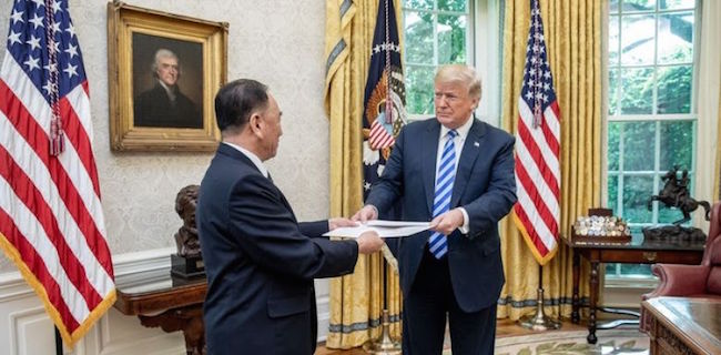 Donald Trump berfoto bersama Kim Yong Chol usai menerima surat itu.