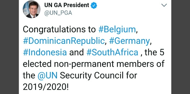 "Selamat kepada Belgia, Republik Dominika, Jerman, Indonesia dan Afrika Selatan, terpilih sebagai lima anggota non-perlemen Dewan Keamanan PBB untuk 2019/2020," tulis LajÄák.