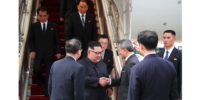 Jenderal Kim Yong Chol tampak berdiri di belakang Kim Jong Un setibanya turun dari tangga Pesawat Jet Air Cina di Bandara Changi, Singapura, pada Minggu siang (10/6).