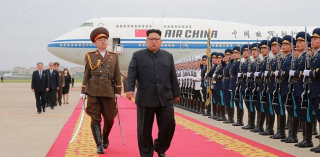 Kim disambut pasukan kehormatan Korut saat pesawat jet Air China mendarat di Pyongyang pada Kamis pagi (13/6).