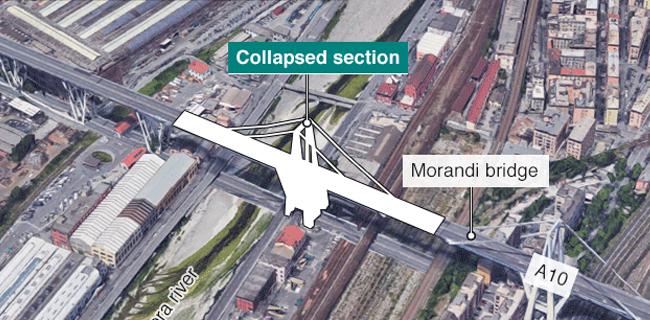 Dalam insiden tersebut, sebanyak 39 orang tewas ketika jembatan Morandi di Liguria runtuh. Pada saat itu, puluhan kendaraan jatuh dari ketinggian 45 meter dan menyebabkan banyak orang terjebak di bawah reruntuhan jembatan dan juga di dalam kendaraan.