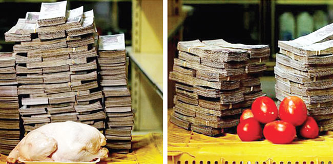 Fotografer Reuters Carlos GarÂcia Rawlins dalam jepretannya memberikan gambaran. Seekor ayam dengan berat 2,4 kg dijual di Caracas seharga 14,6 juta bolivar atau setara dengan 58,7 dolar AS. Jika dirupiahkan hanya sekitar Rp 53 ribu. Harga satu gulung tisu toilet 2,6 juta bolivar atau setara dengan 10,4 dolar AS (sekitar Rp 103 ribu). Untuk membeli sebungkus pembalut perempuan, membutuhkan uang 3,5 juta Bolivar atau sekitar 14 dolar (Rp 201 ribu).