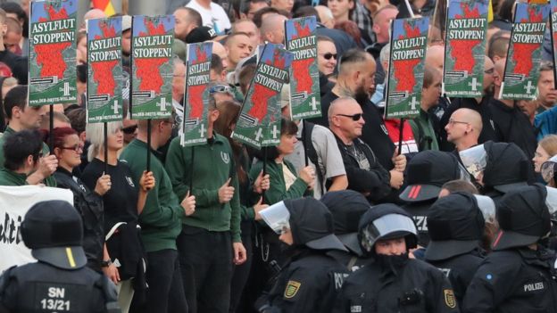 Kelompok-kelompok sayap kanan berbaris di kota timur setelah seorang pria Jerman, yakni Daniel H tewas dalam pertempuran yang melibatkan dua pria muda asal Suriah dan Irak akhir pekan kemarin.
