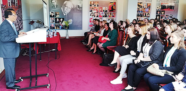 Dia juga diberi kesempatan untuk memberikan kuliah umum di depan sekitar 300 mahasiswa. Dengan mengusung tema “Indonesia-Russia: From Soekarno-Khrushchev to Current Challengesâ€, Dubes Wahid membahas seputar hubungan bilateral kedua negara ditinjau dari sejarah pre-kemerdekaan sampai kondisi dunia saat ini dan tantangan yang dihadapi kedua negara.