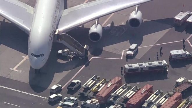 Segera setelah itu, maskapai penerbangan Emirates membuat cuitan di Twitter bahwa penumpang yang sakit sedang dirawat dan mereka yang tidak terpengaruh akan diizinkan meninggalkan pesawat.