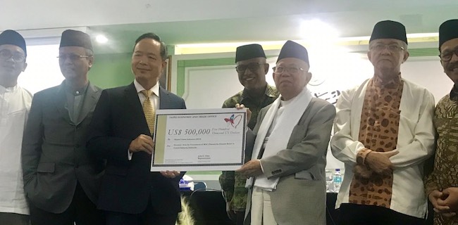 Bantuan tersebut diserahkan langsung kepada Ketua Majelis Ulama Indonesia (MUI), Kiai Haji Ma’ruf Amin di Kantor MUI, Menteng, Jakarta Pusat, Selasa (9/10).