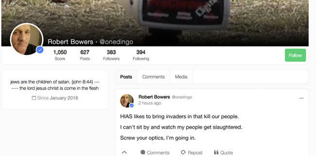 Bowers mengambil alih Gab, sebuah jaringan sosial yang dibuat khusus untuk kebebasan berbicara dan semakin populer di kalangan aktivis alt-right serta nasionalis kulit putih.