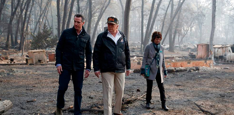 Presiden Amerika Serikat Donald Trump berbicara dengan Gubernur California terpilih Gavin Newsom (kiri) dan Walikota Paradise Jody Jones (kanan) selama kunjungannya ke lokasi kebakaran di Paradise California pada Sabtu (17/11). Kebakaran di California sejak awal November ini merupakan yang terburuk dalam sejarah dan telah merenggut 71 nyawa serta lebih dari 1.000 orang lainnya dinyatakan hilang. Associated Press