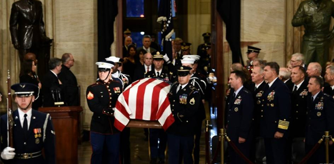 Jasad mantan Presiden Amerika Serikat George HW Bush ditempatkan di US Capitol untuk disemayamkan mulai hari Senin (3/12). < SEBELUMNYA